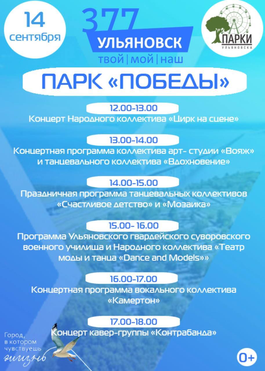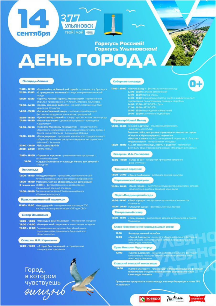 На эспланаде состоится фестиваль частных образовательных организаций, а также будет представлена программа средних профессиональных учебных заведений и их предприятий-партнёров «Город мастеров». Издательский дом «Ульяновская правда» представит фотовыставку «СВОИ» - кадры из зоны проведения СВО.