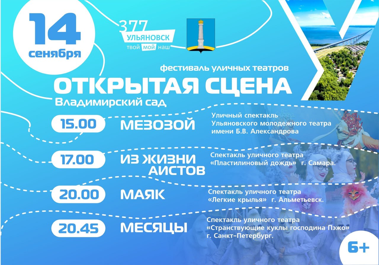 Во «Владимирском саду» будет организован фестиваль уличных театров. Ульяновск представит собственный спектакль «Мезозой», созданный профессиональным коллективом Ульяновского молодёжного театра. Также приглашены известные профессиональные коллективы из Альметьевска, Санкт-Петербурга и Самары.